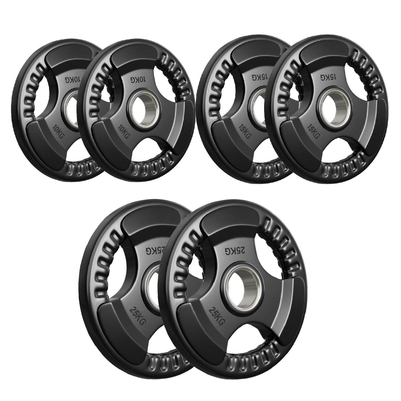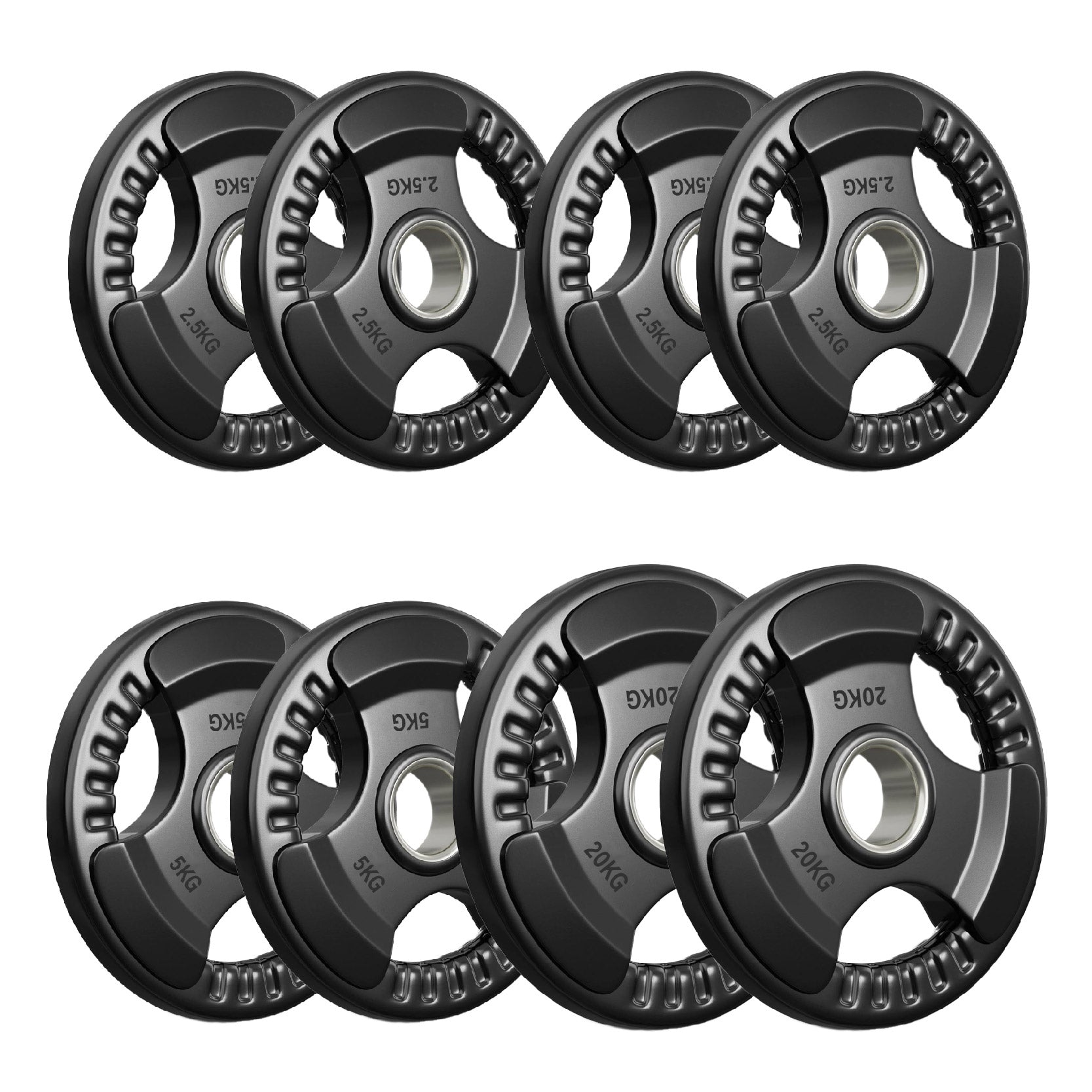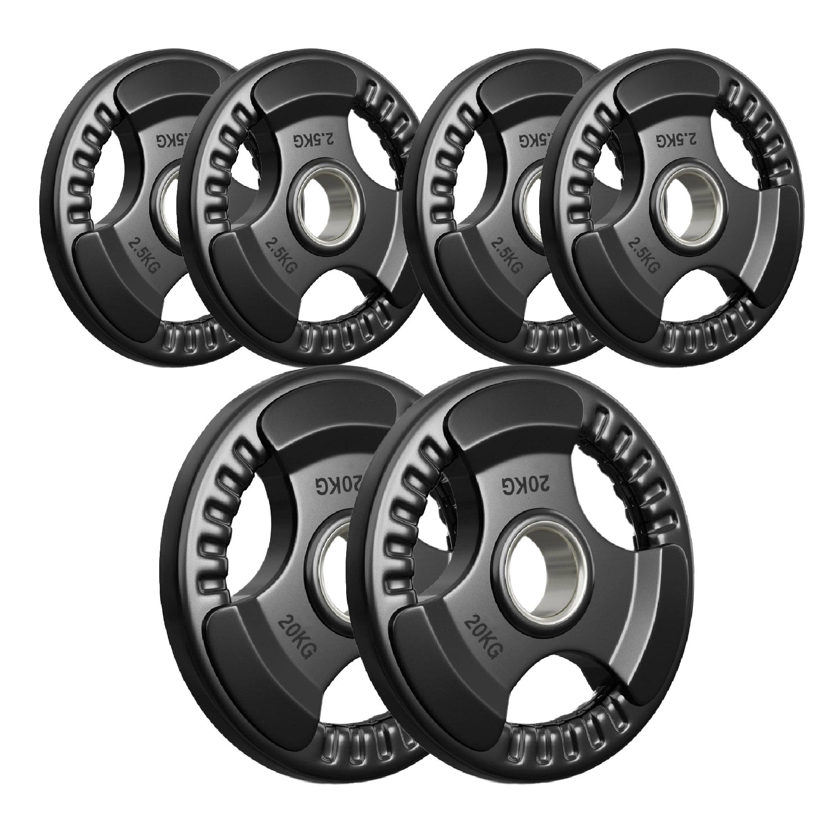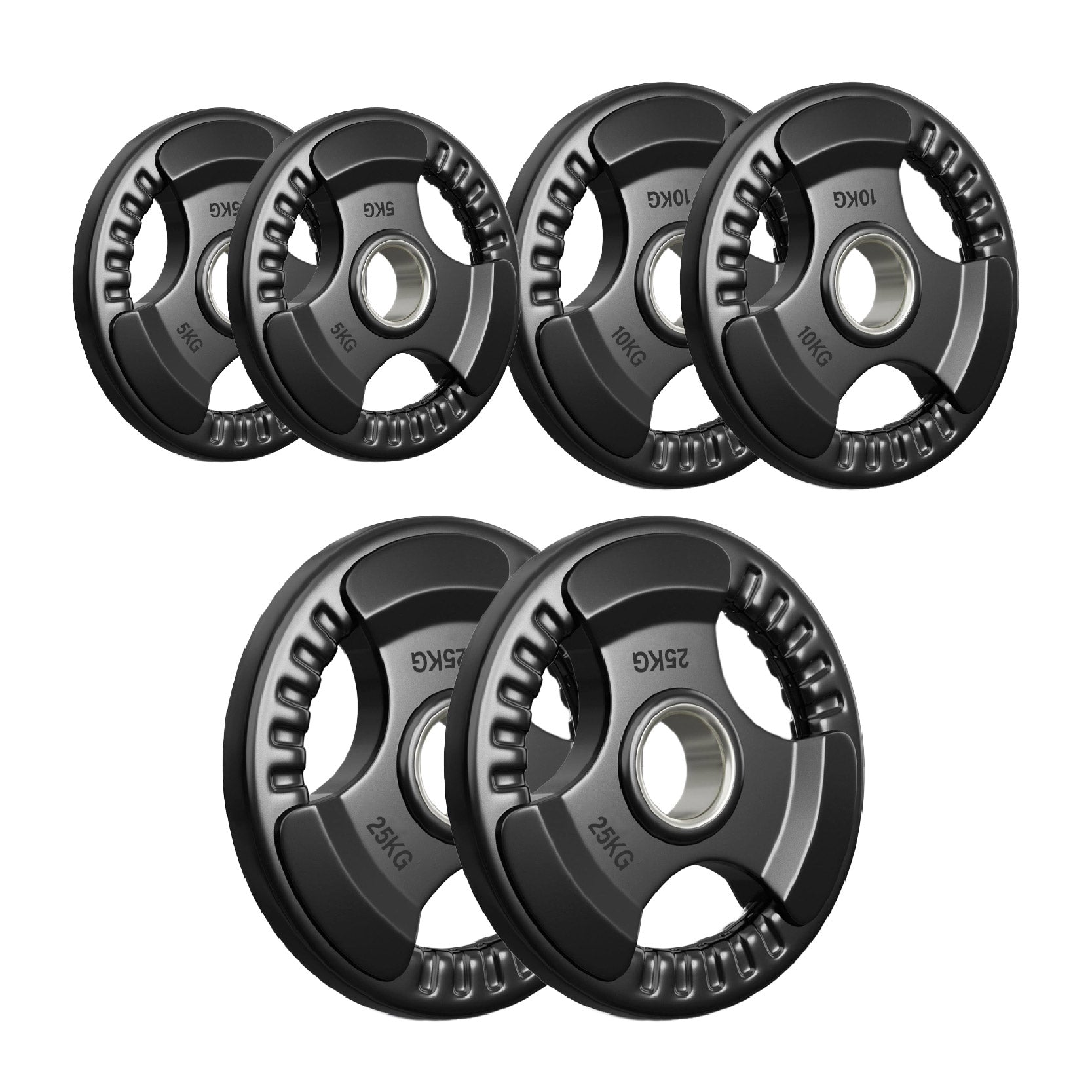 Encased in a durable black rubber coating, these plates offer superior floor protection, noise reduction, and resistance to chipping and corrosion, making them ideal for both home gyms and commercial fitness facilities. Designed to fit all standard 2-inch Olympic barbells, dumbbell handles, and plate-loaded machines, these versatile weight plates ensure seamless compatibility with your existing equipment. Whether you're focusing on strength gains, muscle definition, or functional training, these Tri-Grip Olympic Weight Plates provide the performance, safety, and convenience serious lifters demand.